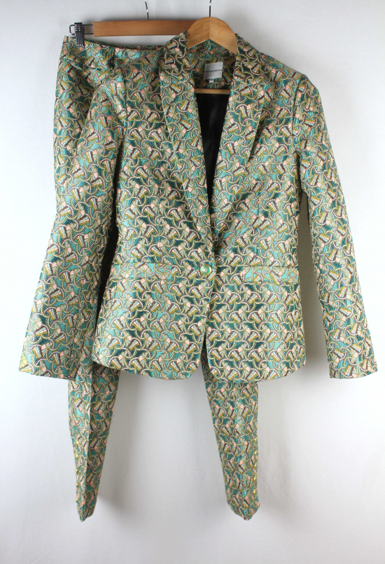 Conjunto Blazer y pantalon en tejido brocado en tonos verdes, marron. rosa, azul y forado. BLAZER 1 boton. bolsillos de ojal. botones de escudo verde y dorado. manga con 3 botones. forro. Talla Xs amplia Medidas hombro 37,5 cm, sisa 44 cm cinturilla 40 cm, largo 62 cm, manga 62 cm PANTALON con costuras en la pernera. abertura en los bajos laterales con 5 botones. trabillas para cinturon Talla 40 pequeña Medidas cinturilla 36 cm cadera 47 cm, tiro 25 cm, largo 100 cm, ancho bajo 16 cm